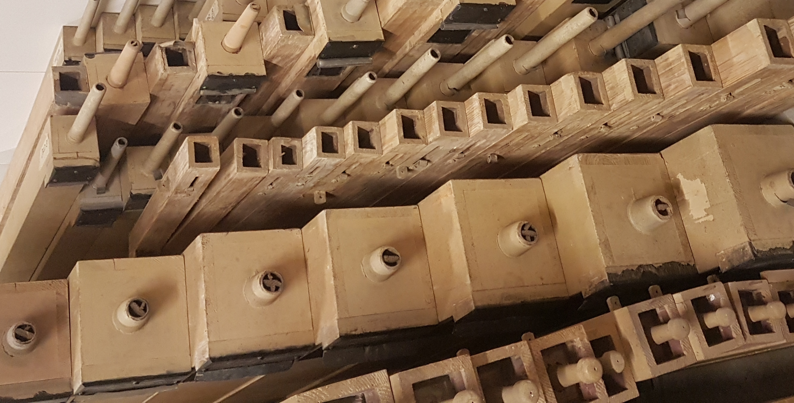 The intention was to reuse 13 registers from the former Goršič organ from Vipava in the new organ for the parish of Šentvid pri Stični. Among them is a 16′ Bombarde pedal register with half resonators, wooden boots (two wooden blocks, c and cis) and free reeds, which were originally made by the organ builders Chwatal & Sohn, Merseburg (the inscription can be found on the C tone shallot). This company, which specialised in the manufacture of organ parts, was founded in 1884 by Carl Otto Chwatal (1848-1902).