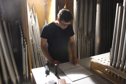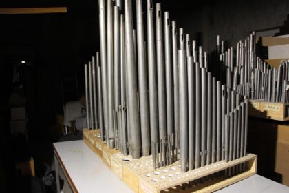 The metal pipes of the Goršič organ were made in the German organ workshop Gebrüder Link. In September 2021, the preserved pipes were inventoried and documented, revealing that the data obtained did not entirely correspond with the publications in the aforementioned report by Hugolin Sattner. One notable difference was found in the details concerning the transitions between the wooden and metal pipes. It turned out that when the Goršič organ in Log pri Vipava (Op. 64, 1897) was rebuilt, the Oboa 8′ register was replaced by the Oboë 8′ register from the organ in Vipava. The original register is still stored in the Orglarstvo Močnik warehouse. The pipes of both registers have a beating reed, as in the Ursuline organ in Ljubljana (Op. 56, 1891), but the reed from Log pri Vipavi differs in the construction of the shallot. The Oboë 8′ from the Ursuline organ posesses a soldered shallot, while the Oboë 8′ from Logo pri Vipavi features a compressed shallot.
