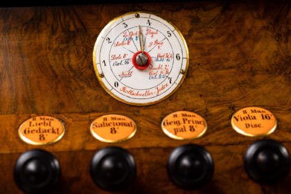 “The organ case has been restored, and the exterior is now in harmony with the sounds of this complex instrument. A thick layer of dust and soot was removed, and cracks and damages in the wood were filled in, carefully retouched and also reconstructed. We have refreshed and replaced the worn gilding. The original painting – an imitation of wood in the technique of life – once again glowed in warm tones.”