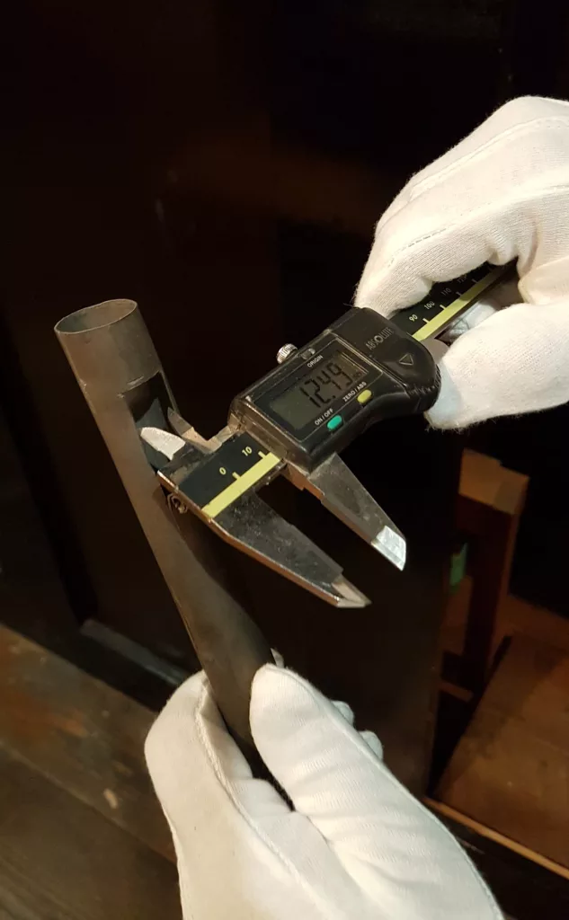 The third criterion is the regulating slots (expressions). It is interesting how they are made. Jenko carved the regulating slots in the old pipes in a flat manner, not in proportionally. In Jenko’s new pipes, we see a continuous relationship between the mensural, the width of the regulating slots and the height of the ring above it. In the reused pipes, these two ratios are quite flatly determined (they change stepwise every two octaves).